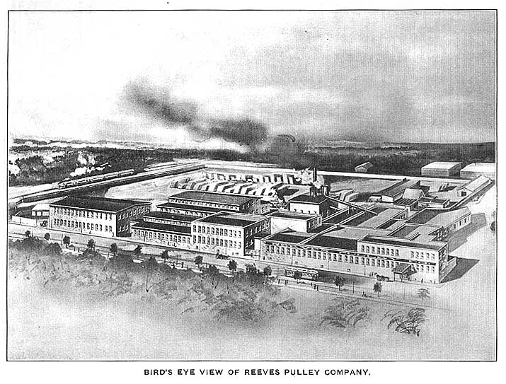 From a small concern manufacturing wood pulleys to a plant with more than 300,000 square feet of floor space is the story of the growth of the Reeves Pulley Company. The firm began the manufacture of wood pulleys in 1888, occupying a small space in one of the Reeves Stacker works. the first building of their present plant was compelted in 1890, and from that time on the growth of the firm has been rapid and substantial. After making the wood pulleys for several years, they began the manufacture of a Friction Clutch and later added to the number of their products a Variable Speed Transmission. the Company maintain large sales rooms in Chicago where they deal in all kinds of power transmission. Their own machinery is sold all over the world wherever such machinery is used.
